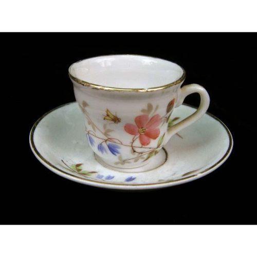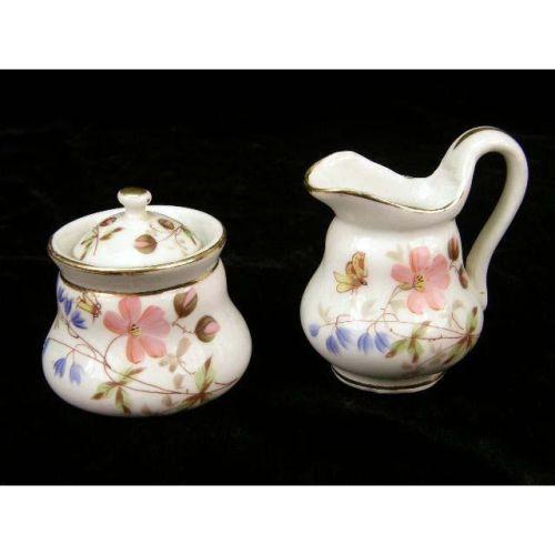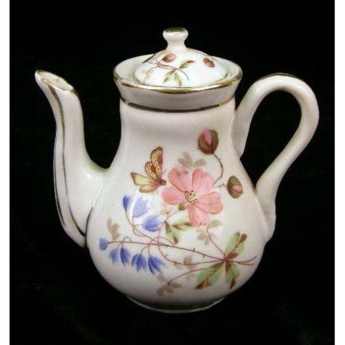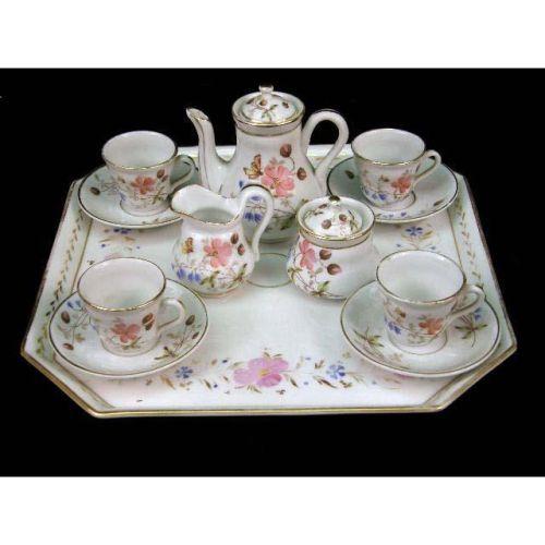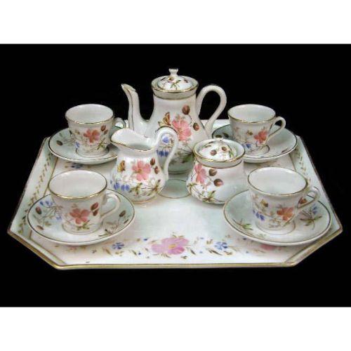 AN ASSEMBLED POLYCHROME DECORATED PORCELAIN CHILDREN`S TEA SERVICE<BR><BR>including a tea pot, covered sugar and creamer, four cups and saucers, and a tray. Wear. Tea pot 3 3/4"h