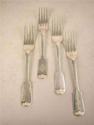 AN ASSEMBLED SET OF TWENTY-ONE ENGLISH SILVER FIDDLE BACK LUNCHEON FORKS; Hallmarked, 32 T.O.