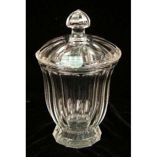 AN ASSORTED GROUP OF COLORLESS GLASS TABLE ARTICLES<BR><BR>Including, a covered jar, a lid, and three decanters, one missing a stopper, 5 pieces