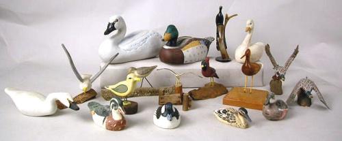 AN ASSORTED GROUP OF DIMINUTIVE WATERFOWL AND BIRD CARVINGS; Comprising wooden, ceramic, and plastic examples, varying degrees of condition, Approximately 30 pieces