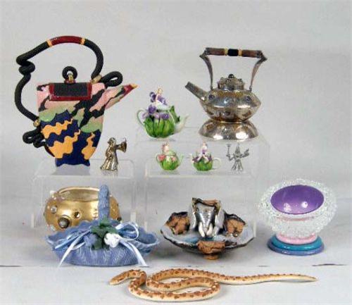 Including, a jeweled white metal teapot, a glass sculpture, a pottery elephant-form dish, and a ceramic gilt-decorated bangle bracelet, 6"h,