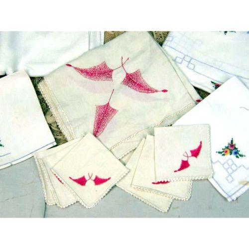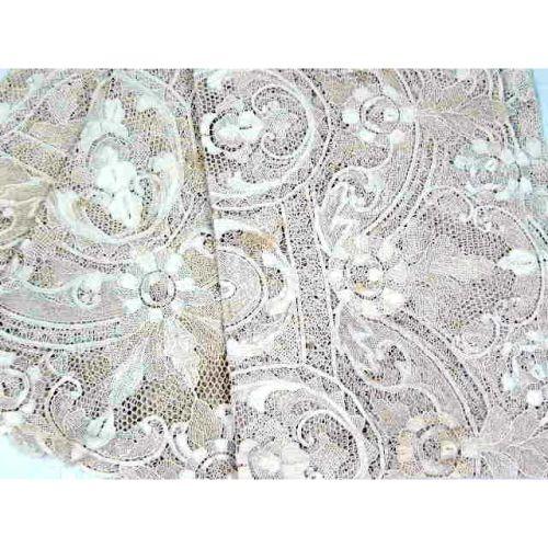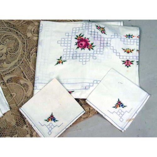 AN ASSORTED GROUP OF TABLE LINENS<BR><BR>Including Venetian hand made lace tablecloth and napkins, a cross stitch table cloth and napkins, and damask table clothes, stains,