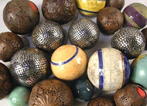 AN ASSORTED GROUP OF TWENTY-0NE CERAMIC, METAL AND WOODEN SPHERES.