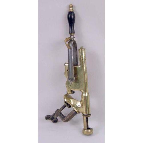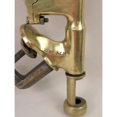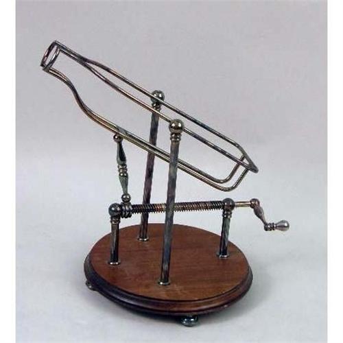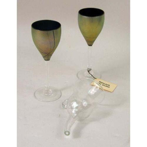 AN ASSORTED GROUP OF WINE ACCESSORIES<BR><BR>Including, a colorless glass funnel, a silver plated caddy, and a brass corker marked "The Acme," and two art glass wine goblets 5 pieces