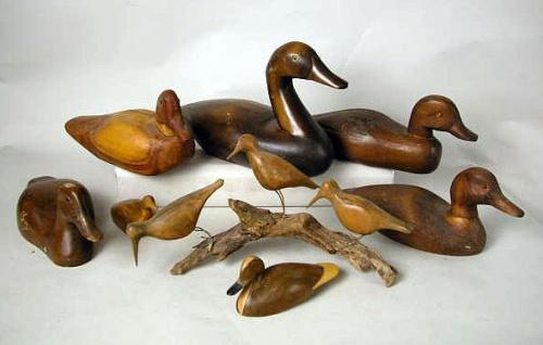 AN ASSORTED GROUP OF WOOD DECOY CARVINGS; All lack paint and are of various species and sizes, Together with a carved waterfowl head nut cracker, chips, losses, and wear 11 pieces