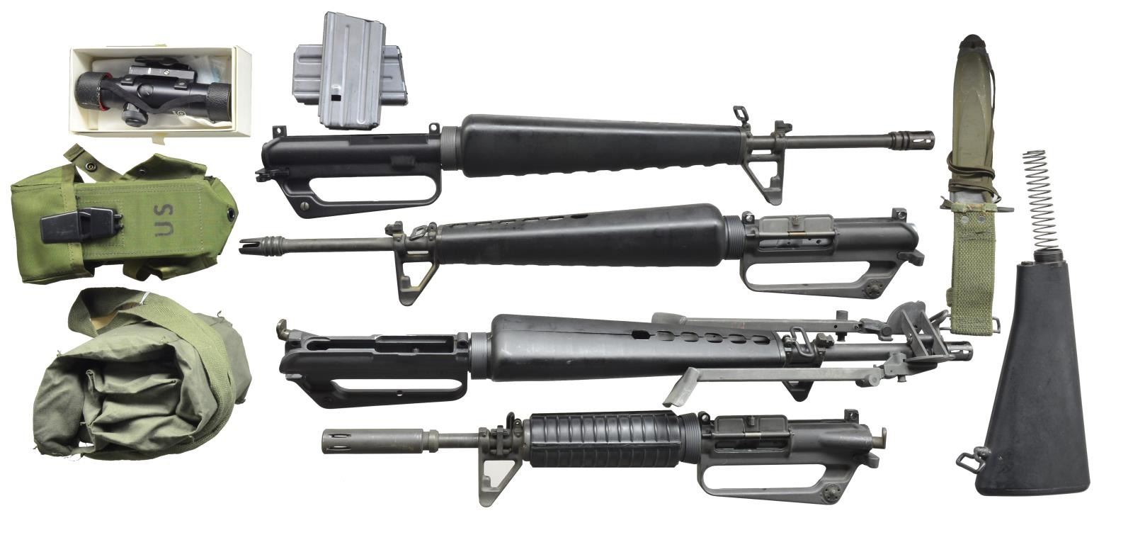 An interesting collection of mostly early & unique components for the extremely popular modular weapon system. This lot includes 4 barreled upper receivers as described below. Upper receiver #1 has 20" heavy bbl. w/ A2 style flash hider. Front mounted heavy bipod assembly, beavertail handguards, teardrop forward assist & straight profile delta ring. E1 style rear sight adj. for windage through use of sight adjustment tool, integral to carry handle. Bbl. stamped “14.5” & is accompanied by a hanging tag explaining this is an experimental HBAR bbl. assembly, 1 of only 50 units mfg. by Colt. Standard gray anodized finish on upper receiver. Bayonet lug is stamped w/ “9”. Tag states purpose of this unit was originally intended to test numerous rates of twist including 9 to 1, 12 to 1 & 14.5 to 1; only 4 such test units ever left the Colt factory, this being S# 9 of 50. Upper receiver #2 has 20" bbl. w/ beavertail forend & 3 prong flash hider E1 style rear sight adj. for windage through use of sight adj. tool integral to carry handle. Flat profile delta ring, no forward assist or brass deflector. Complete w/ charging handle & what appears to be a chromed M16 bolt & carrier. Standard gray anodized finish on upper receiver. Upper receiver #3 has 20" bbl. w/ A2 style flash hider, bbl. marked “C MP”. E1 style rear sight adj. for windage through use of sight adj. tool integral to carry handle. Flat profile delta ring. Upper receiver marked “PM” below rear sight. Rnd. forward assist, no brass deflect, includes charging handle. Dark black finish on upper receiver. Upper receiver #4 is a carbine variant w/ short A2 handguards & bbl. measures 15 1/4" over the 4 3/4" flash hider. E1 style rear sight adj. for windage through use of sight adj. tool, integral to carry handle. Tapered delta ring, teardrop forward assist, no brass deflector, includes charging handle & M16 bolt carrier group. No bayonet lug, but has a left side swing swivel attachment mounted on bbl. below front sight. Original 3X20 AR15 Sporter rifle scope from Colt Industries firearms division. In original box w/ instructions & factory lens covers. This scope is designed to mount directly to the carry handle & was considered a premier optic until these firearms transitioned into being heavily railed as they currently are. Dark black finish marked “COLT 3X20”, duplex crosshair w/ internal bullet drop compensator adj. from 100 to 500 yds. / 2 USM7 bayonets. Markings include Colt pony logo w/ “COLT’S 62316 / HARTORD, CONN. / U.S.A.”. Black Parkerized finish. Both are in USM8 A1 scabbards. / Mags. include: 9 metal 20 rd., 3 metal 30 rd. 2 Mag. carriers for 3 30 rd. mags. / 2 Complete M16 bolt carrier groups. / 1 A1 10" rear stock w/ buffer, buffer tube & buffer spring. / Several assorted sm. parts, including cleaning rods, AT flash hider, charging handle, cleaning brushes, stripper clip guide, canvas sling & early folding bayonet. CONDITION: receiver assemblies 1, 2 & 4 have shiny bores w/ strong rifling. Receiver assembly 3 has bright bore w/ good rifling. (02-14037/JZ). NON-GUN. $900-1,400.