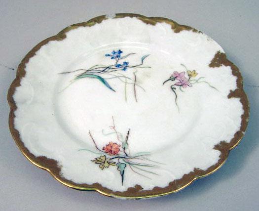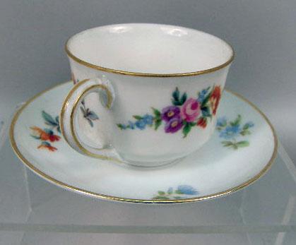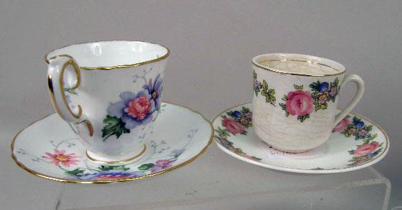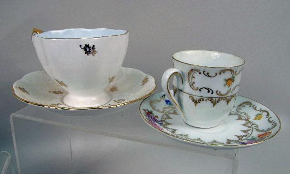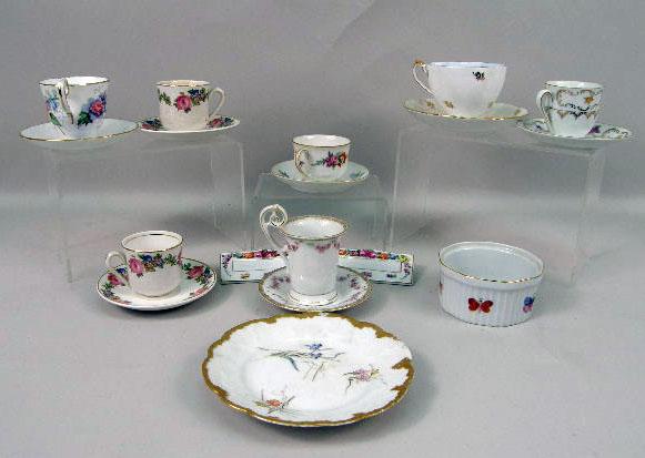 Comprising six each Queen Anne bone china cups and saucers, each cup with a differently-colored interior, six Staffordshire cups and seven saucers in the "England`s Glory" pattern, ten Austin chocolate cups and saucers marked "Higgins & Seiter New York", eleven cups and twelve saucers marked "Winterling Bavaria German", ten gilt-edged plates signed "B.B.Y./Nov. (18)`92" and one cup and two saucers from "JHW Bavaria/The E.B. Taylor Co./Richmond V(irginia)". Together with four strawberry plant-decorated ramekins, an Italian covered jam pot and spoon, a box of twelve Hutschenreuter floral bone china name plates and a small porcelain dish. Approximately 90 pieces.