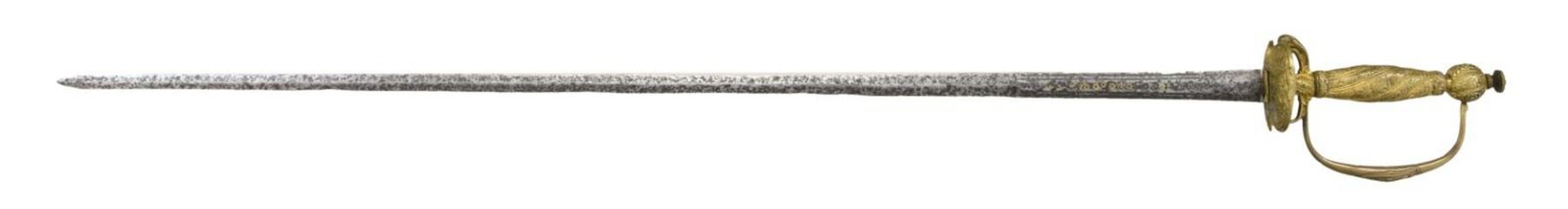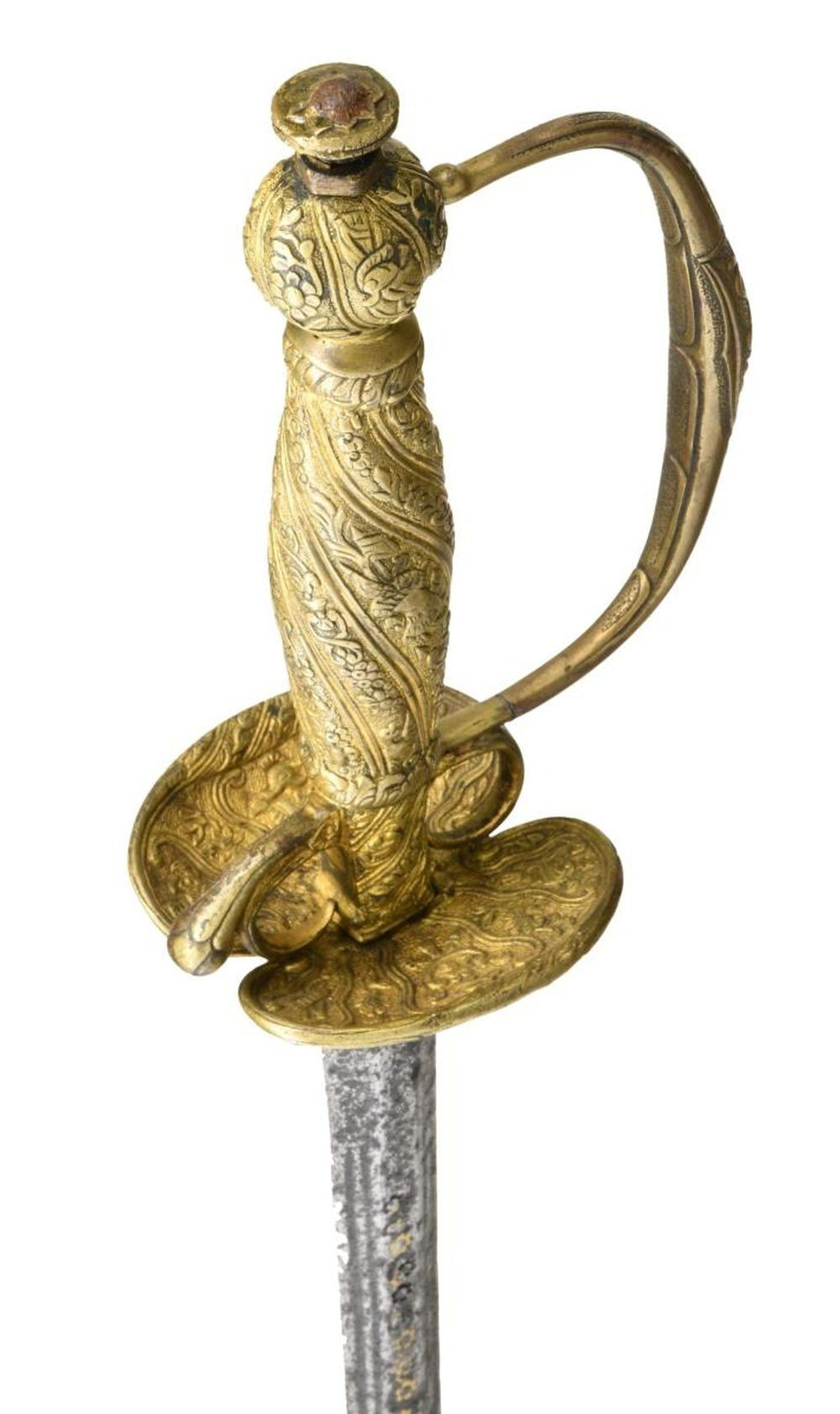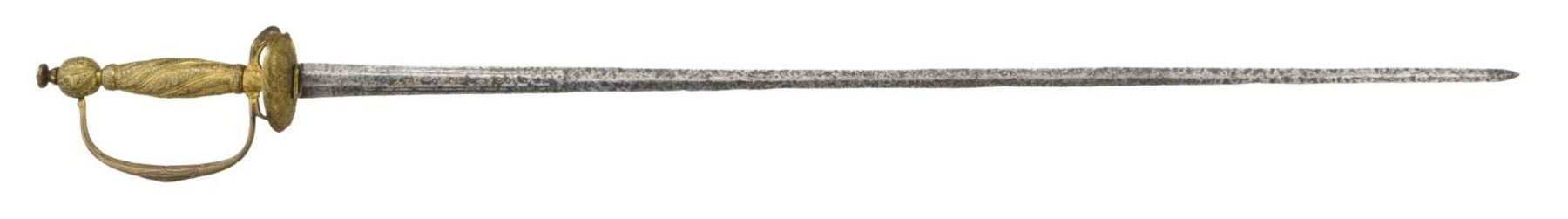 Overall length: 36 1/2". Blade length: 30 1/2". This smallsword appears to utilize a much earlier blade, likely from a 15th to 17th century rapier. It was the custom to reuse & re-hilt family blades with heroic history. This blade is hexagonal for the first 6 1/4" and then transitions to a simple raised medial ridge for the rest of its length. The top facet of the hexagonal portion is inlaid with brass or low carat gold in the form of flowers. The gilded brass hilt depicts numerous arms & foliate motifs. All portions of the hilt are heavily embellished. The pas d’ane are quite high, and the knuckle bow has a central floral motif. The grip & pommel have a similar twisted panel decoration showing a variety of flora & arms. No scabbard. CONDITION: blade has a gray patina and is badly pitted throughout. Hilt shows general light wear and is a bit loose. (02-20099/BF). $600-900.