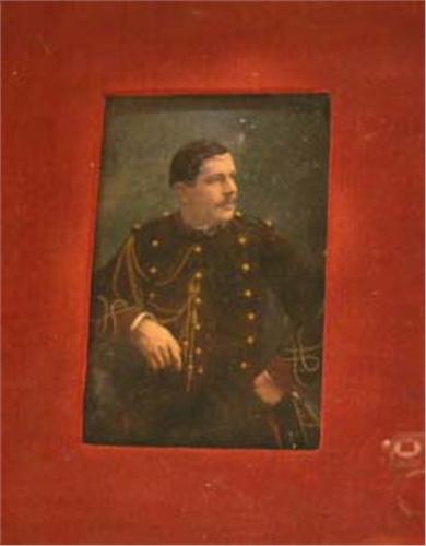 AN EGLOMISE PORTRAIT OF A SOLDIER IN UNIFORM GAZING LEFT; Paint cracked, 5"h x 3"w
