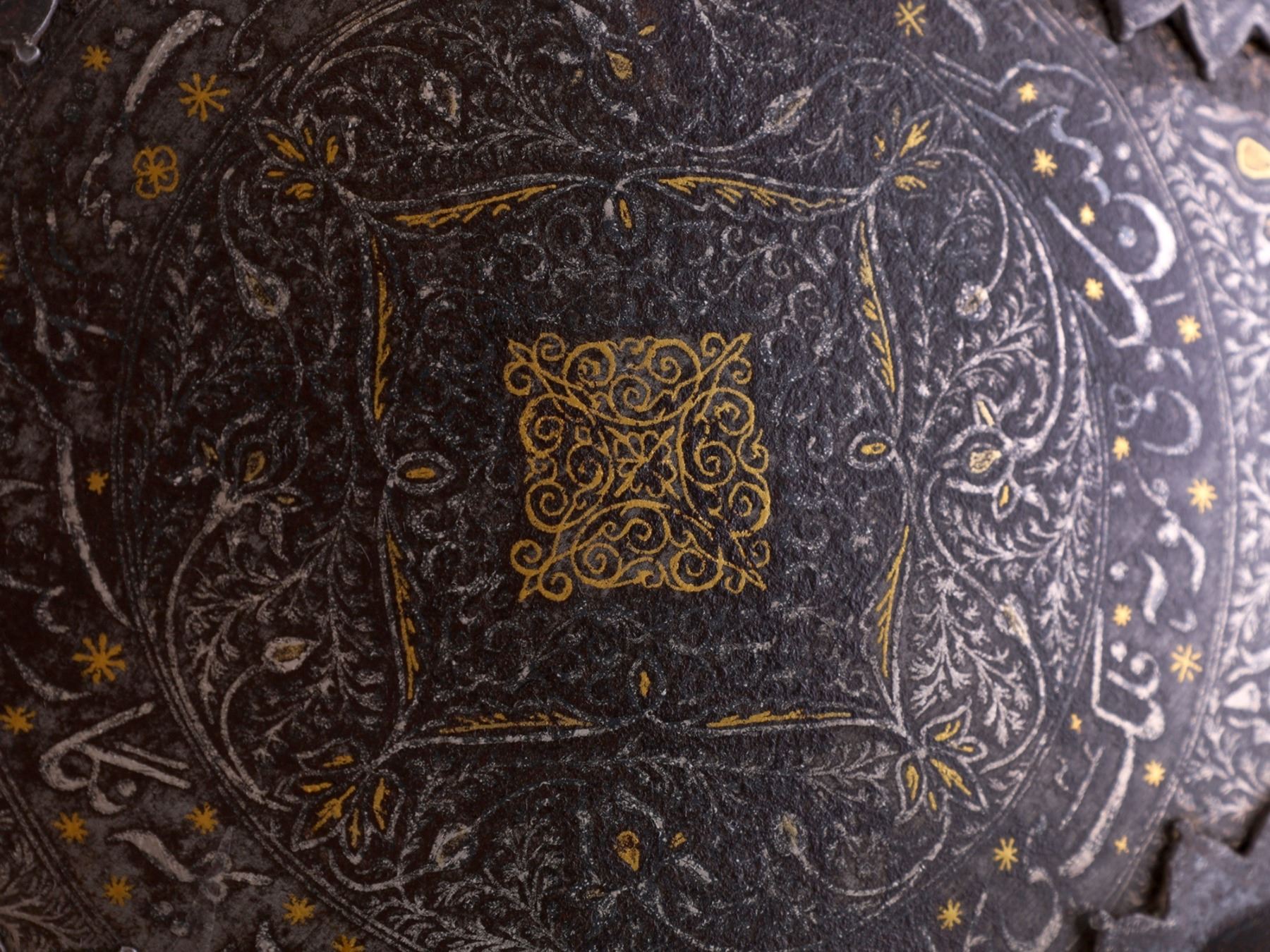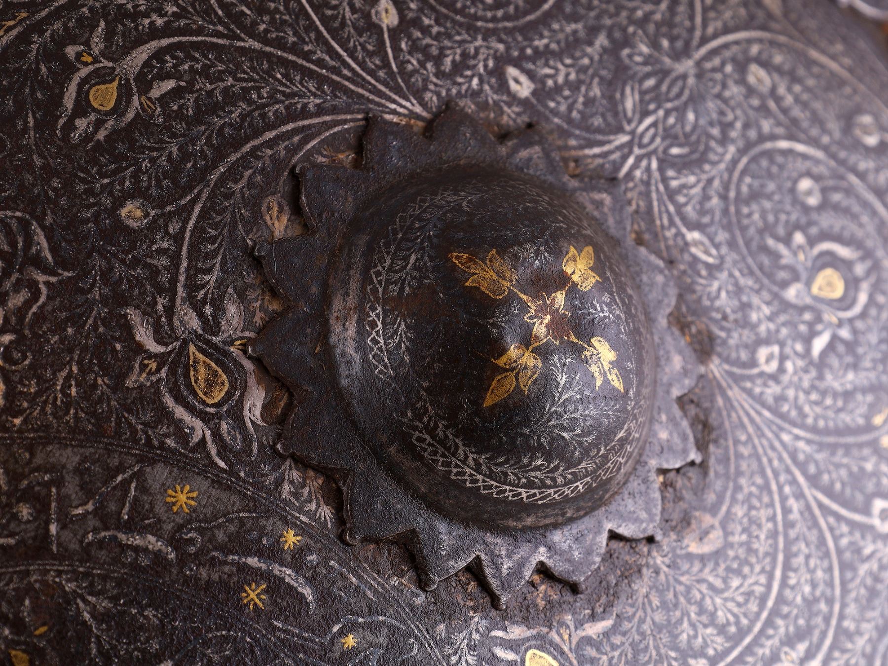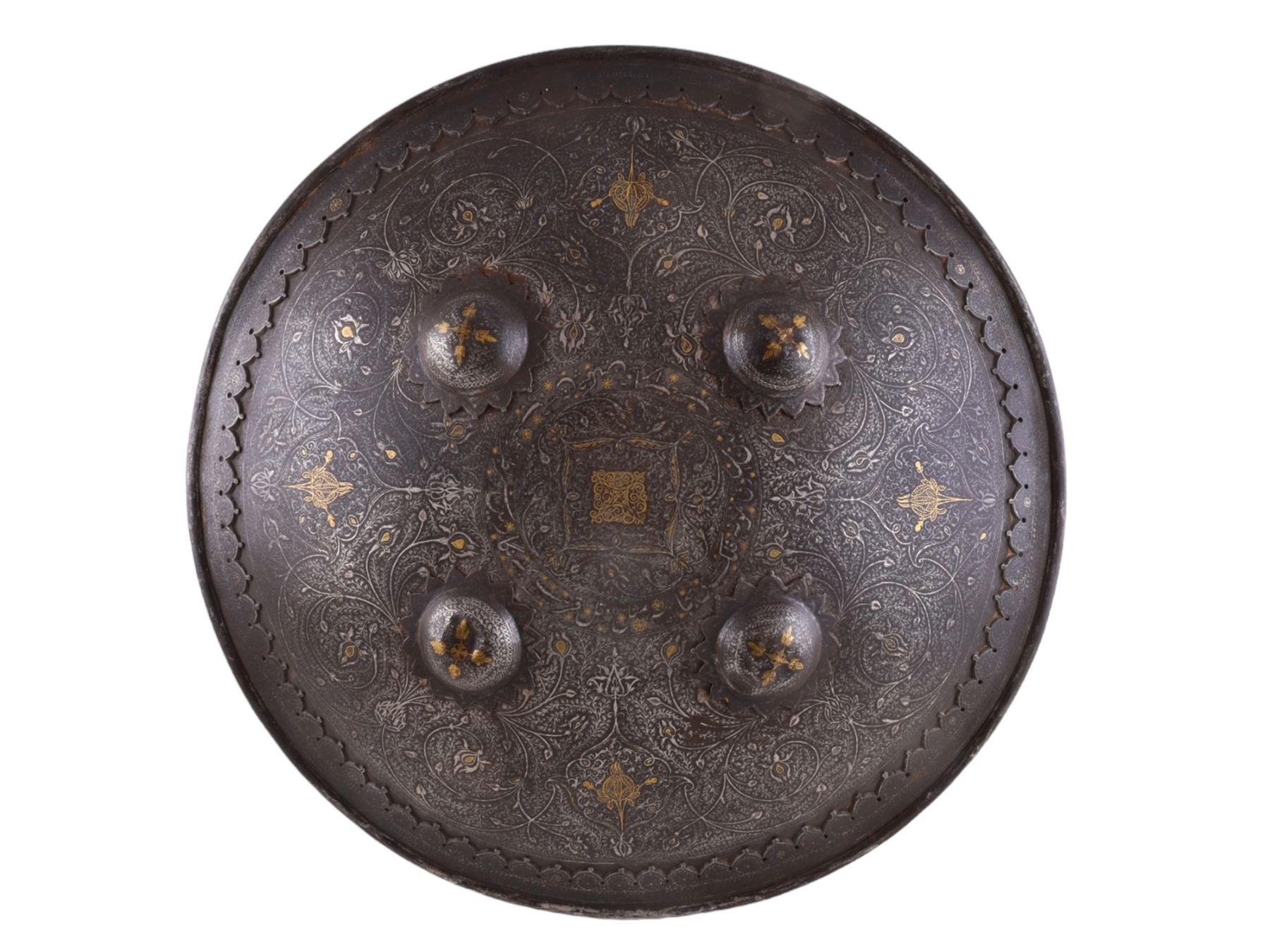 AN ELABORATE INDIAN SHIELD WITH GOLD AND SILVER DAMASCENE, CA. 19TH C.