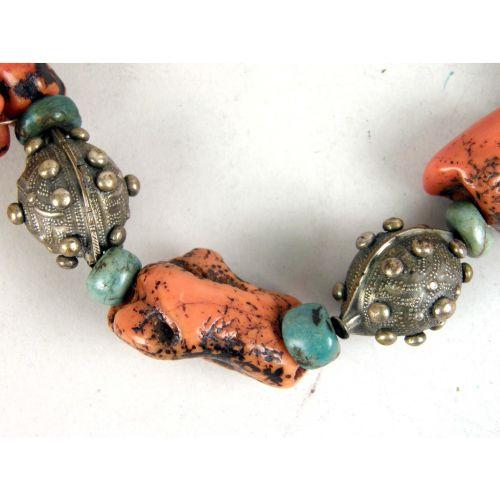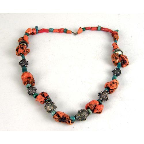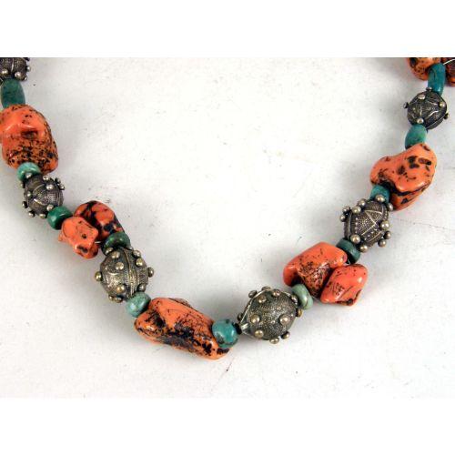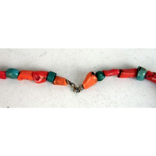 AN ELABORATE NATIVE AMERICAN VERY HEAVY HAND-WROUGHT SILVER CORAL AND TURQUOISE NECKLACE<BR><BR>Apx. 38"long