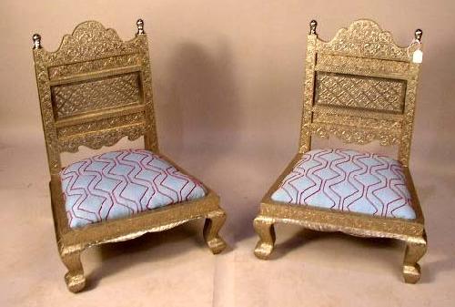 AN ELABORATELY DECORATED SUITE OF GERMAN-SILVER MOUNTED LOW TABLE AND TWO SLIPPER CHAIRS; The circular table on lion-form legs, the chairs with shaped crests, pierced backs and cabriole legs (some repairs) 19"h x 4'd