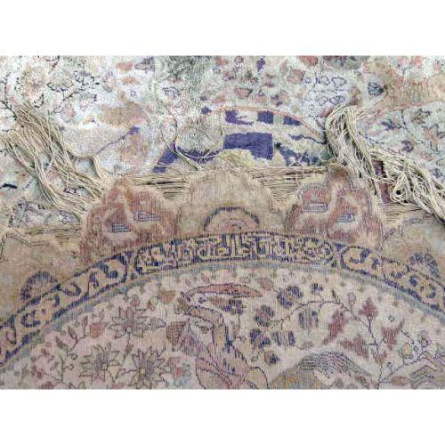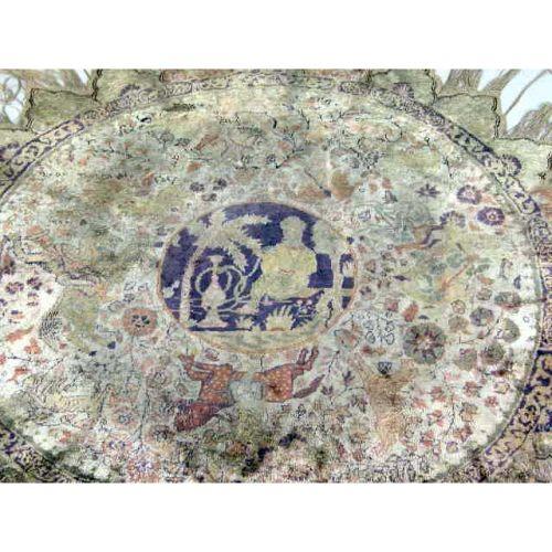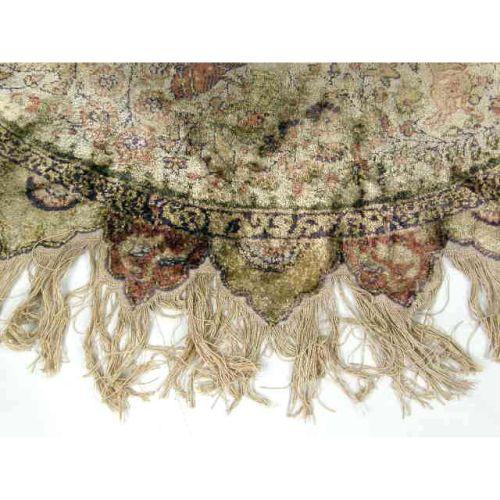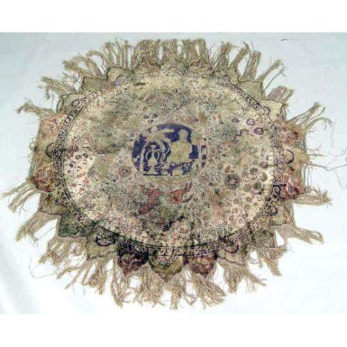 AN ELLIPTICAL SILK TABLE RUG<BR><BR>Possibly Turkish, with central pictorial medallion, 4`10"l x 5`w