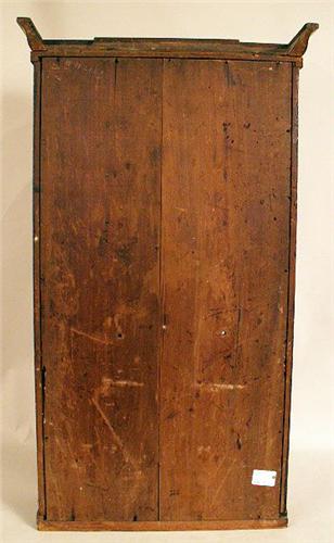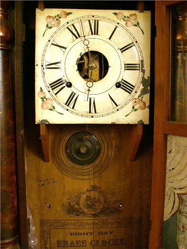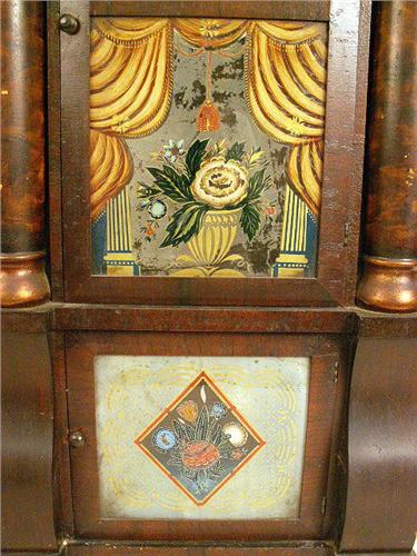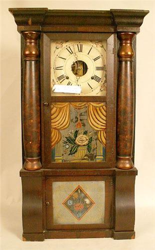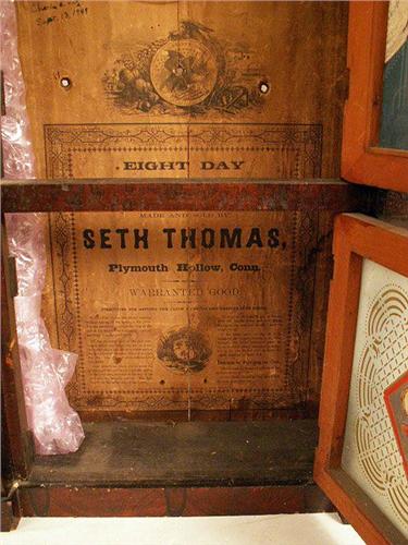 The backboards labeled "Seth Thomas ... Plymouth Hollow, Conn." Some paint loss, losses to veneer, and wear. 32 1/2"h x 18 1/2"w x 6"d.