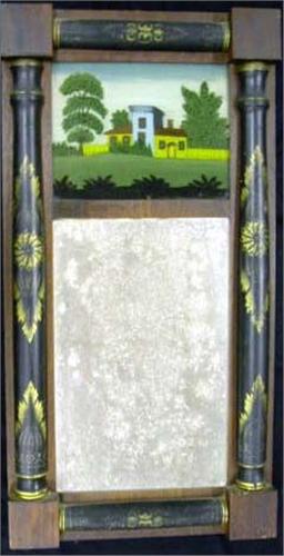 AN EMPIRE MAHOGANY STENCIL-DECORATED EGLOMISE WALL MIRROR; 27"h x 14"w (losses)