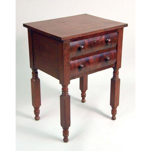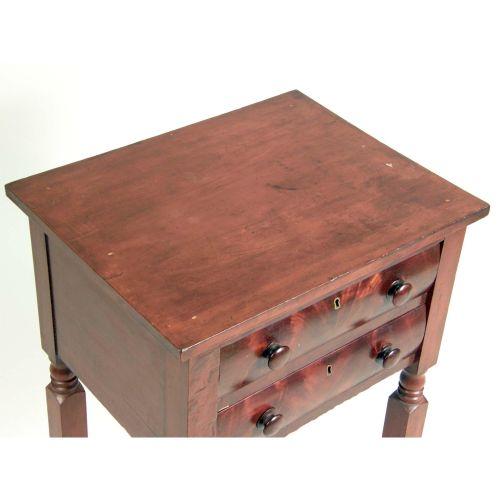 AN EMPIRE MAHOGANY TWO-DRAWER WORK TABLE<BR><BR>together with a smaller example. The first 29" high x 21 1/2" wide x 17" deep. 2 pieces.