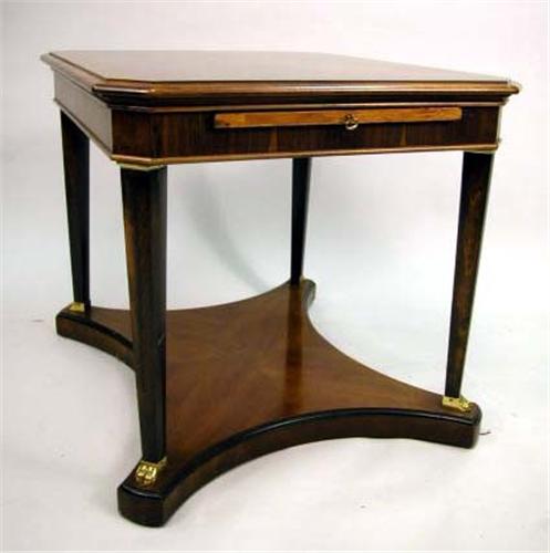 AN EMPIRE STYLE PART EBONIZED AND BRASS MOUNTED ROSEWOOD END TABLE; Of rectangular form with canted corners, supported on tapering ebonized columns with brass paw feet 22"h x 27"w x 23"d