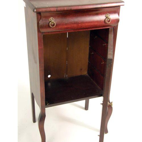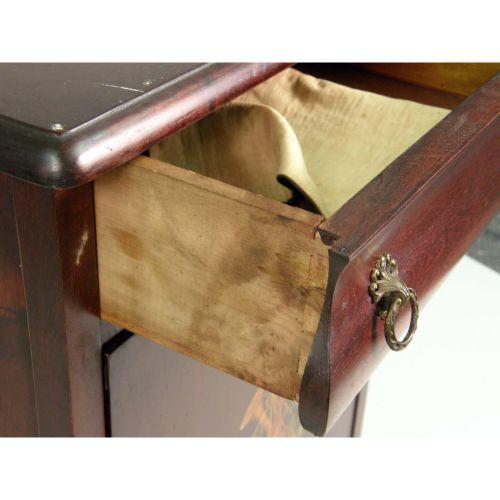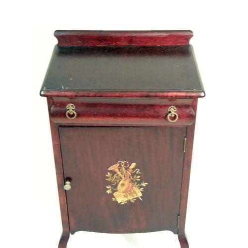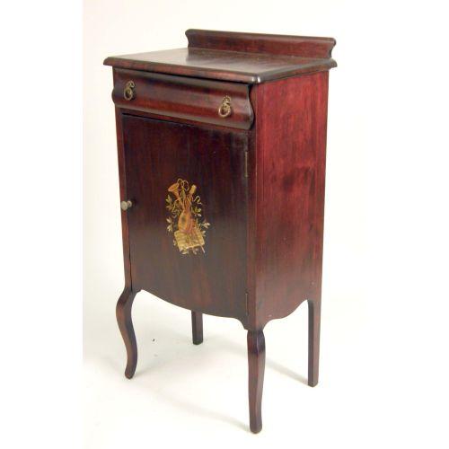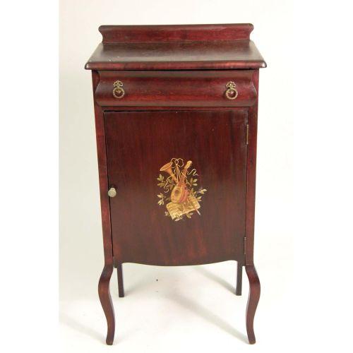 AN EMPIRE-STYLE SHEET MUSIC CABINET<BR><BR>the door with transfer-patterns of musical instruments and a songbook. Shelves lacking. 37 1/2" high x 19 3/4" wide x 13 3/4" deep.