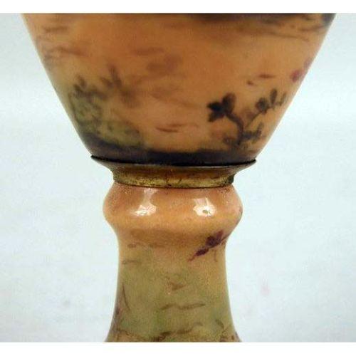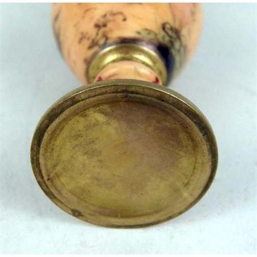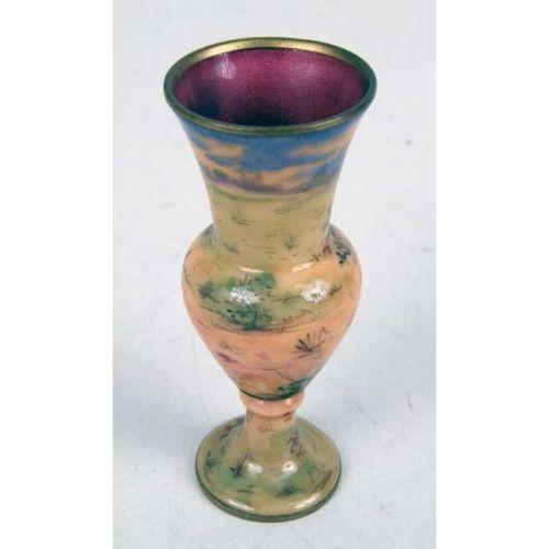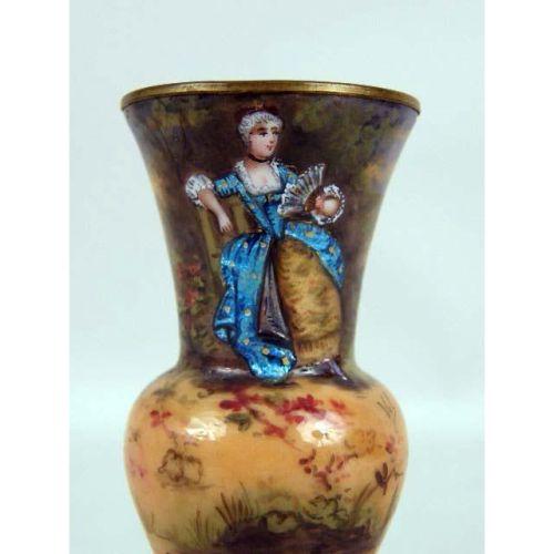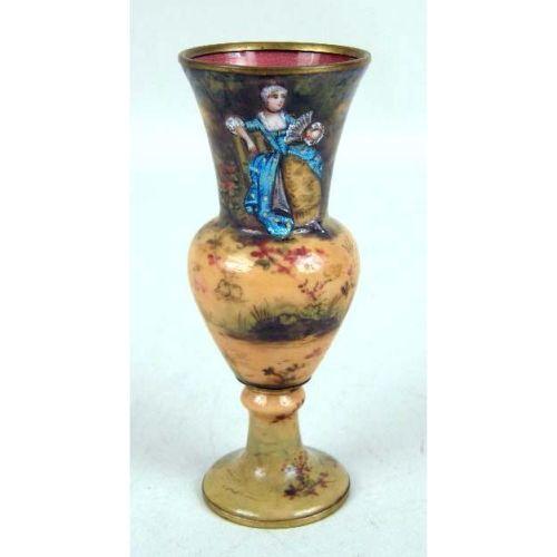 AN ENAMEL AND BRASS POLYCHROME-DECORATED DIMINUTIVE VASE<BR><BR>Depicting a seated lady, wear, 5 1/2"h