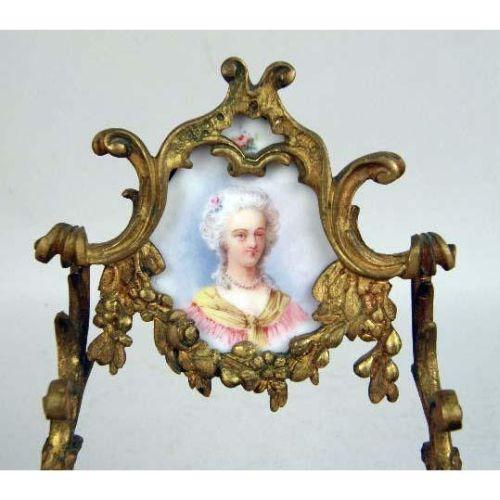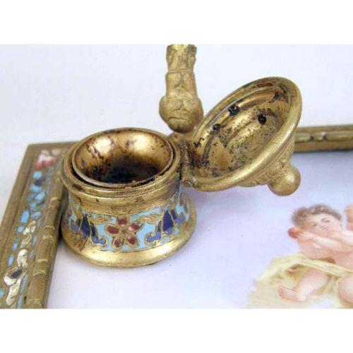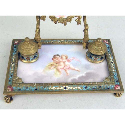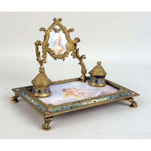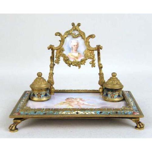 AN ENAMEL-DECORATED BRONZE-MOUNTED PAINTED PORCELAIN ENCRIER<BR><BR>Continental, 5-1/2"h x 7-1/2"w x 5"d
