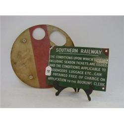 AN ENAMELLED RAILWAY SIGN, white lettering on a dark green ground, 'Southern Railway', relating to ticket issue conditions, 15cm x 23cm, (three corners s.d.) and a circular tin signal plate, diameter 29cm (2) 30-50