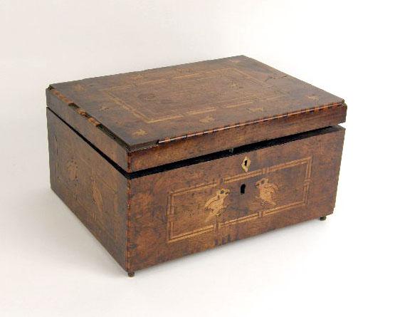 With a till and fitted interior, monogram "H.F.", inlaid with birds, horses, geese, and cows, string coursing along edge. 7 1/4"h x 12 1/2"w x 9 3/4"d Wear, losses to string coursing, lacking two brass mounts.