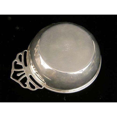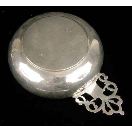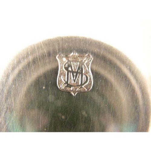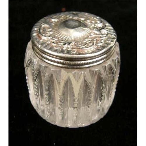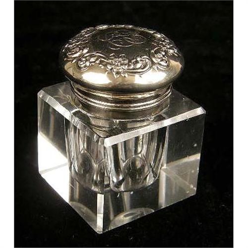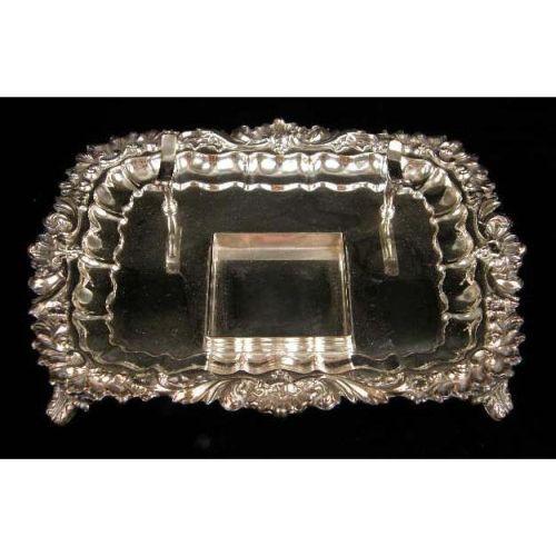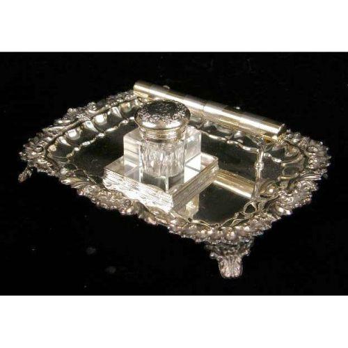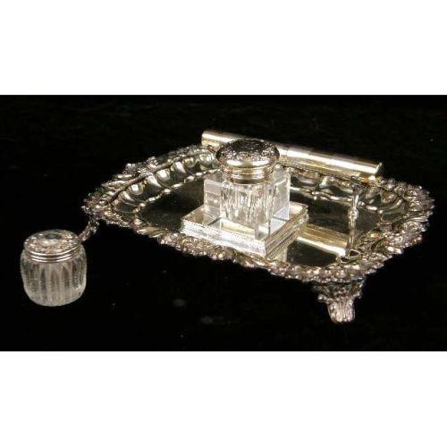 AN ENGLISH SILVER ON COPPER FOOTED WRITING STAND<BR><BR>8-3/4"long, together with a sterling silver hinged lidded ink pot, monogrammed, and a silver metal lidded glass stamp box, and a pen holder
