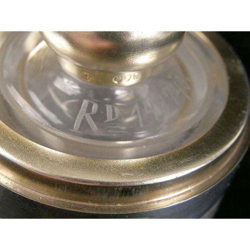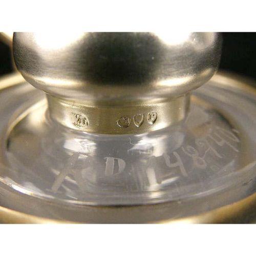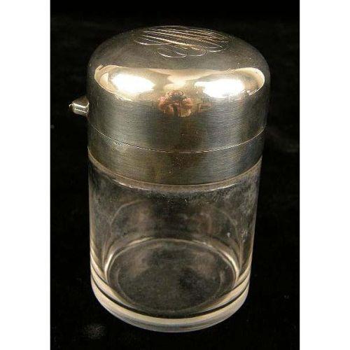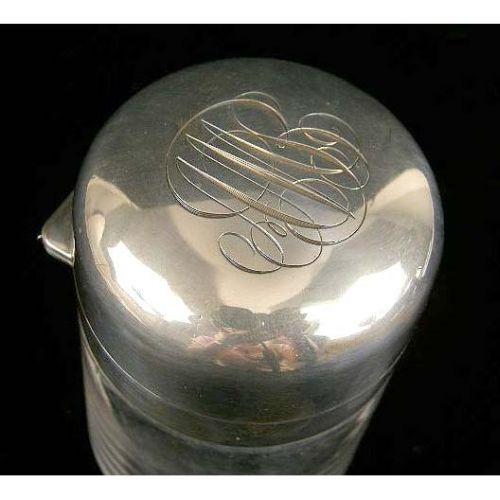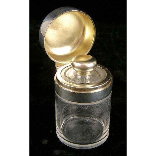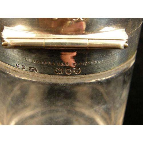 AN ENGLISH STERLING SILVER LIDDED GLASS SCENT BOTTLE<BR><BR>With monogram, stopper under hinged lid, retailed by Leuchars, Piccadilly, hallmarked WL, London, 1890, 3-3/4"h