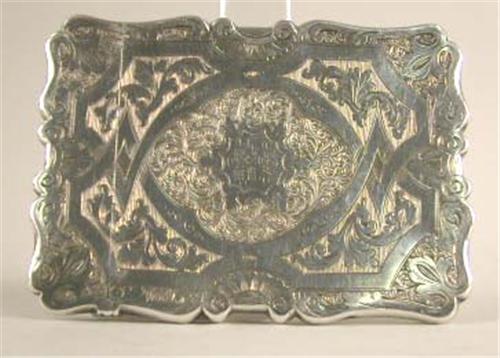 AN ENGLISH STERLING SILVER VICTORIAN HINGED LID CARD CASE; heavily engraved, inscribed, "MW Eleventh, May, 1866", hallmarked, Birmingham, 1865, 3 7/8"h x 2 3/4"w, apx. 1 T.O.