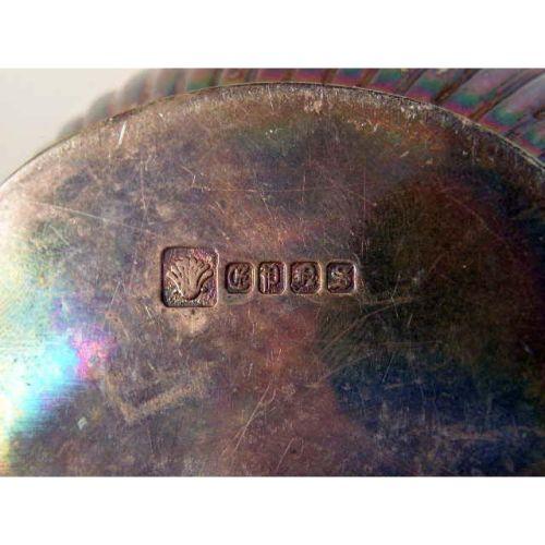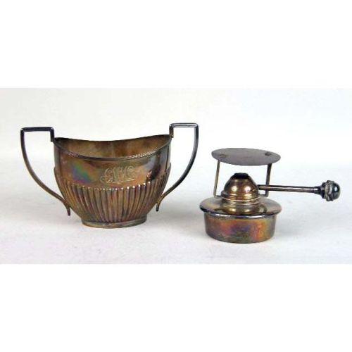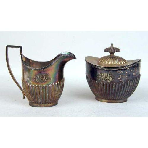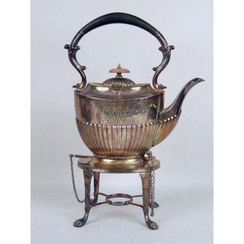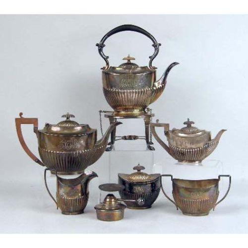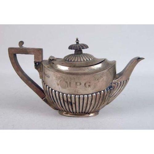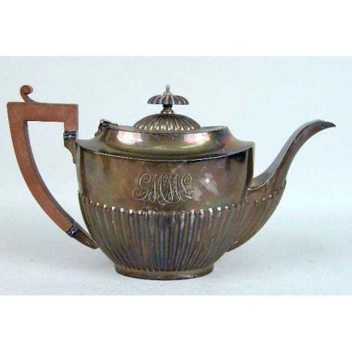 AN ENGLISH STERLING SILVER WOODEN HANDLED SMALL TEAPOT<BR><BR>Monogrammed MPG, hallmarked WD, Sheffield, fluted body, dented, together with a similar English silver on copper five piece tea service, kettle on stand 14"high
