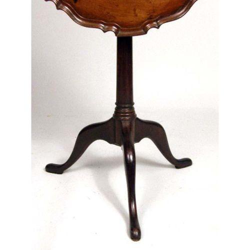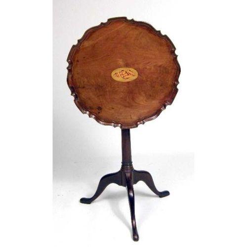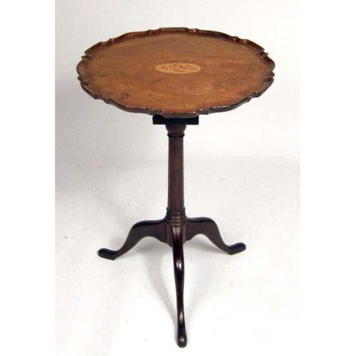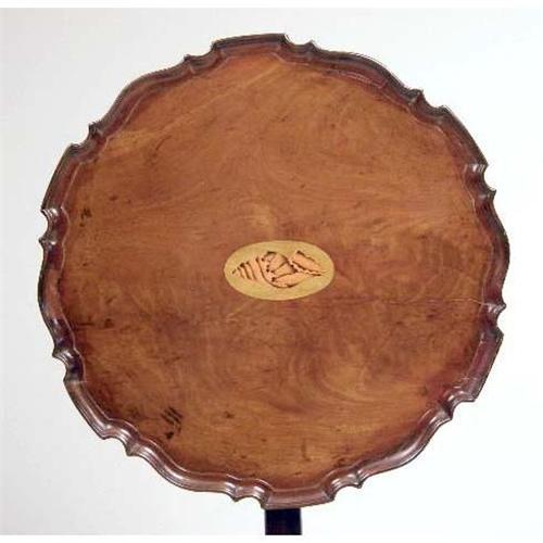 AN ENGLISH WALNUT TILT-TOP BIRDCAGE TEA TABLE<BR><BR>the inlaid seashell probably added later. 28 3/4" high x 20 1/2" diameter.