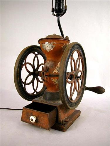 AN ENTERPRIZE COFFEE GRINDER; Red painted and mounted as a lamp, 12"h