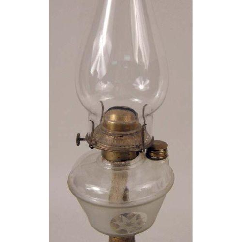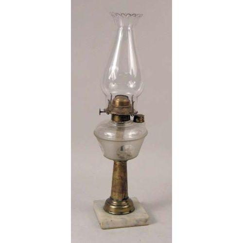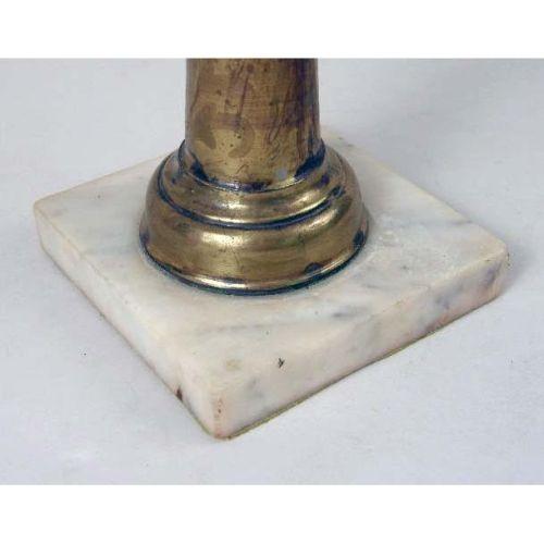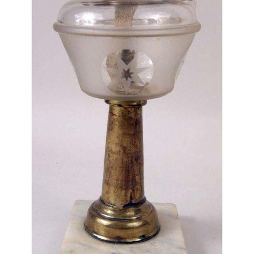 AN ETCHED-GLASS AND REPOUSSE GILT-METAL SPIRIT LAMP<BR><BR>on a marble base. 19" high.