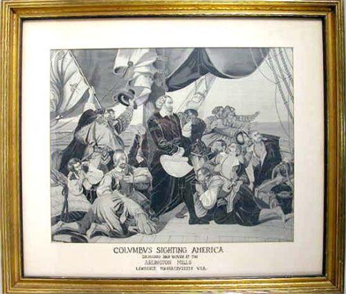 Titled "Columbus Sighting America", by Arlington Mills, unsigned. 29"h x 33"w.