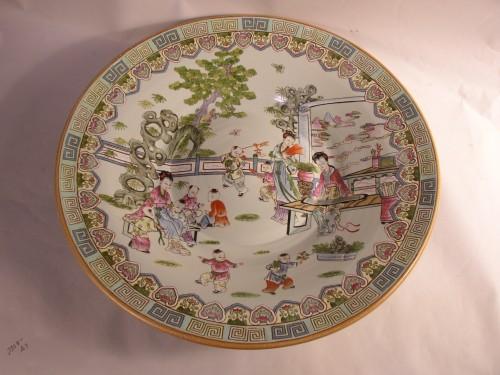 AN EXTREMELY LARGE POLYCHROME-DECORATED CHINESE EXPORT CIRCULAR SERVING DISH; Depicting children and adult, two of which are playing musical instruments 25" diameter