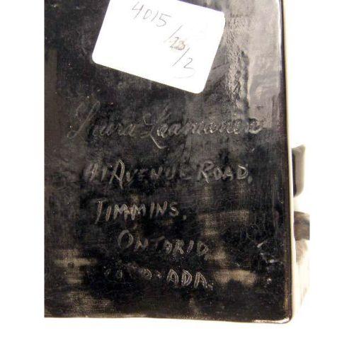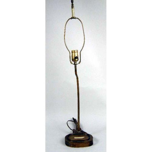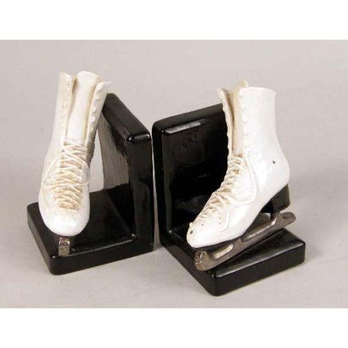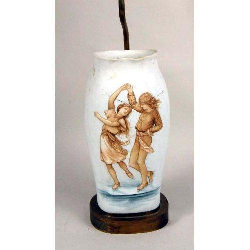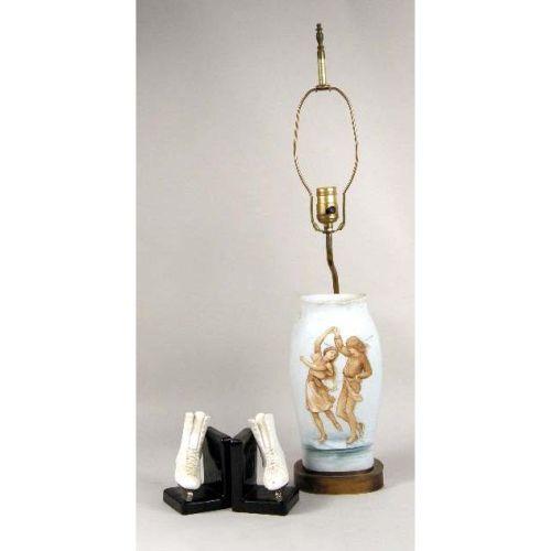 AN ICE SKATING THEMED GROUP<BR><BR>Comprising, a bisque vase fitted as a lamp depicting ice skaters, crack, 11"h - 28"h, Together with a pair of ice skate figural porcelain bookends, impressed, Laura Laamanen 41 Venue Road, Timmins, Ontario, Canada, losses, 5"h x 4"w