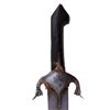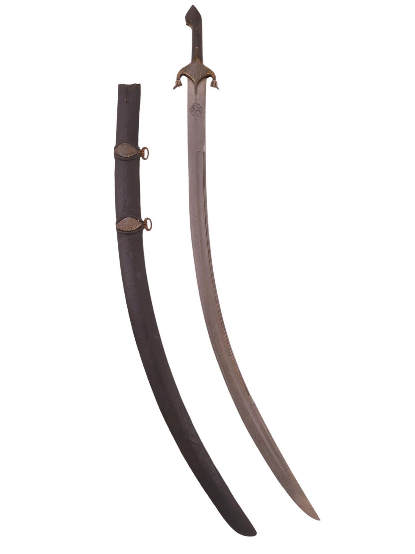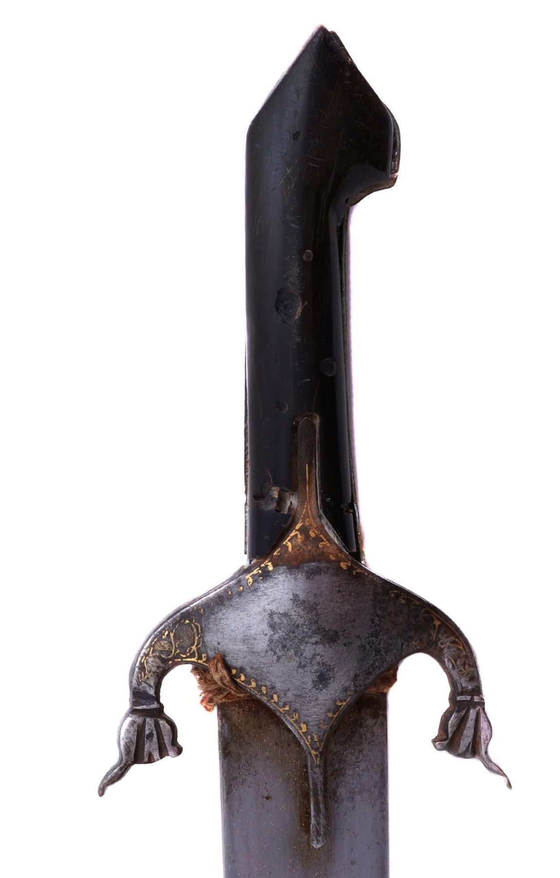 With a large curved blaze of Wootz steel, a cartouche with Arabic inscription on the forte. Steel cross guard with gold inlay, polished horn grip scales. Wooded scabbard with two steel fittings.