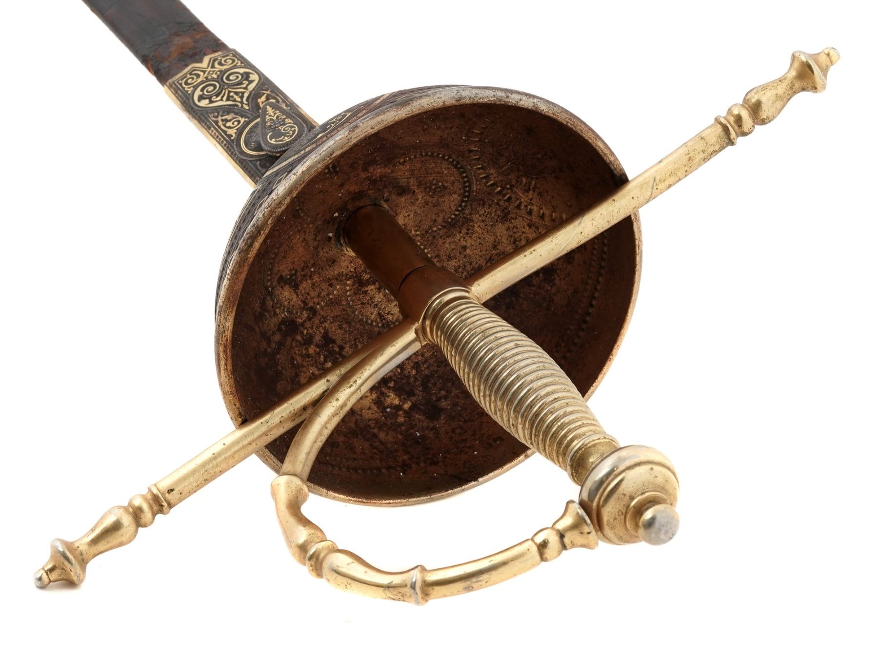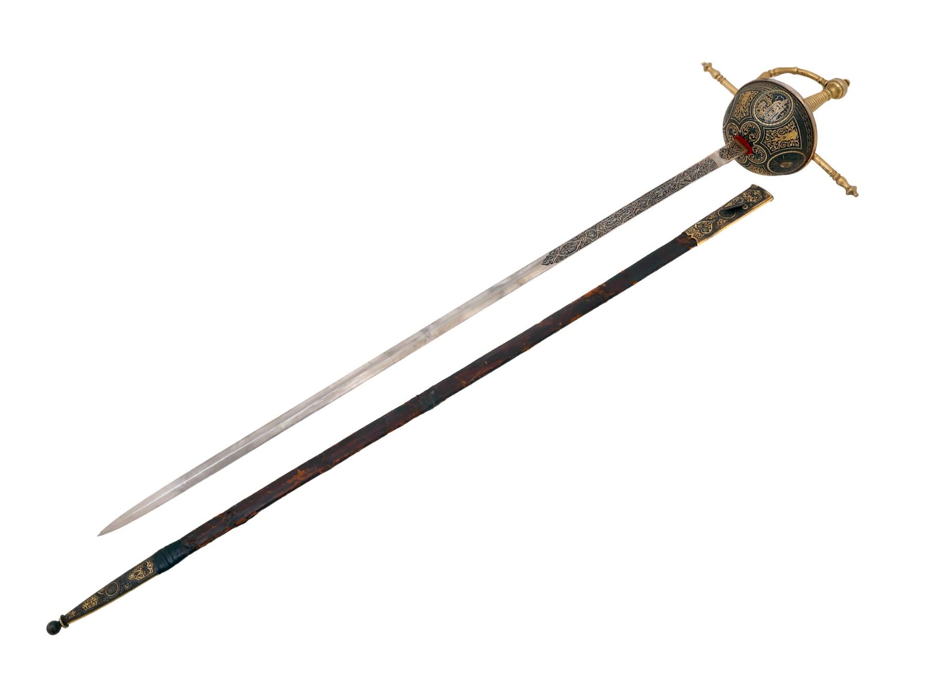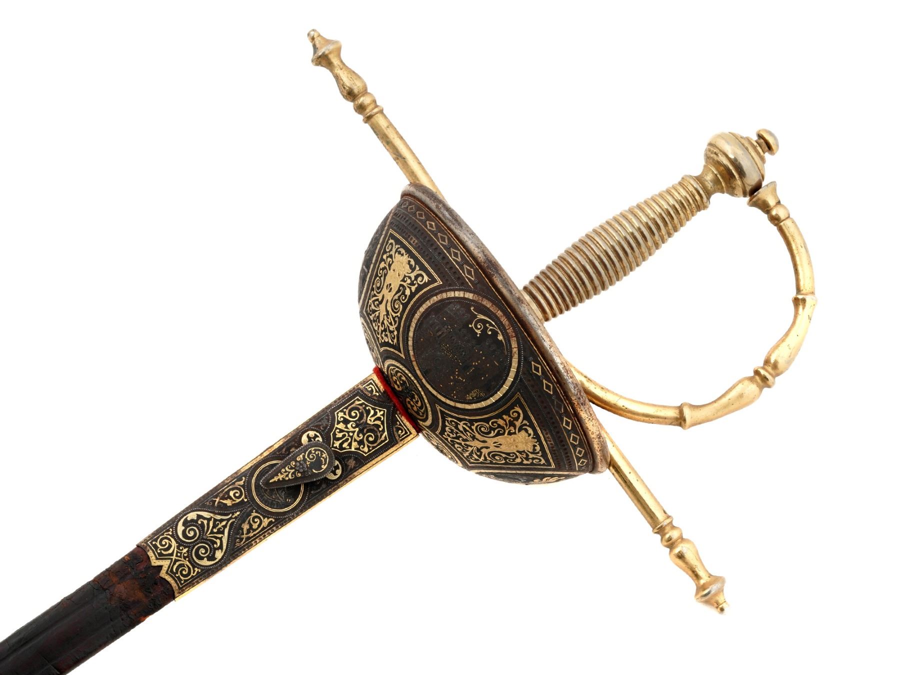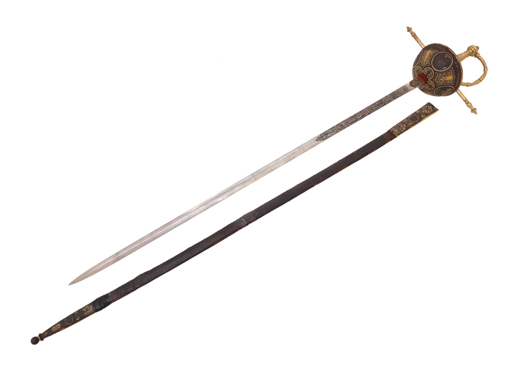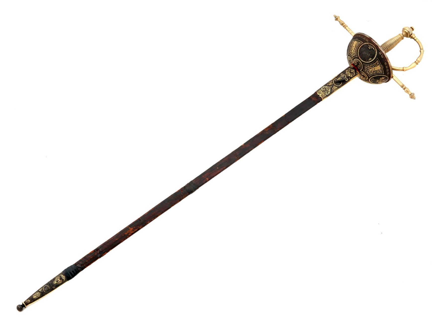 AN IMPORTANT TOLEDO, SPANISH DAMASCENE RAPIER WITH SHEATH, 19-20 CC.