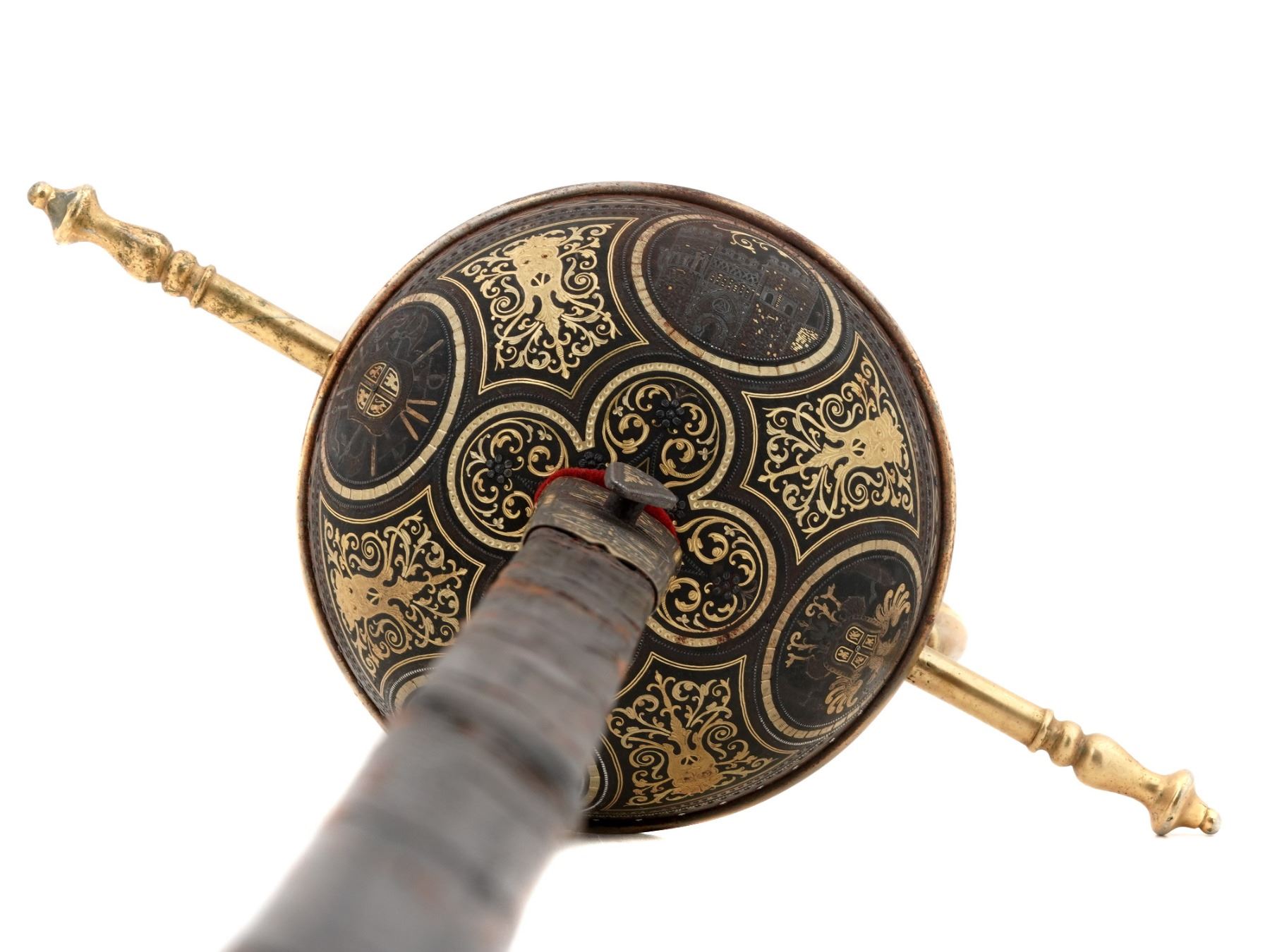 A very fine Toledo cup hilt rapier with a gilt interior etched blase, superbly decorated steel cup and scabbard chape and throat with silver and gold inlay.