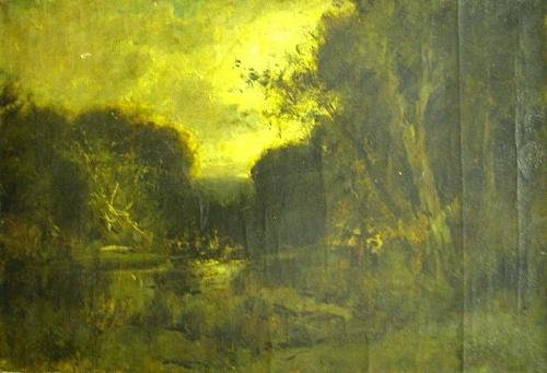 AN IMPRESSIONISTIC OIL ON CANVAS; depicting a shadowy woodland scene, verso with a label inscribed "William Keith (American, 1838-1911)/signed indistinctly/$4,250". Small puncture. 15" x 22"