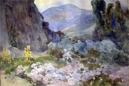AN IMPRESSIONISTIC WATERCOLOR ON PAPER; depicting a verdant valley and far mountain range, signed l.l. Scanno Garlande, verso with the notation "Signed behind watercolor 'Evening in the Abruzzi Mountains'". Together with a chalk on paper forest scene, sig