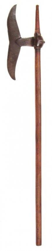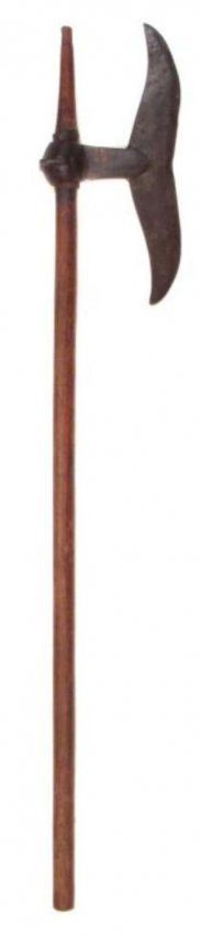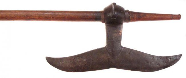 Bhil People, handforged blade on wooden haft. Mid-19th century.Worn.Overall length 79 cm.