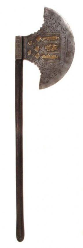 The massive steel head chiseled overall with floral work and the Hindu god Krishna flanked by two gopis, all inlaid in brass within pavilions topped by brass parasols. On its hardwood haft.Mid-late 19th century. Minor wear overall. Overall length 91.5 cm.