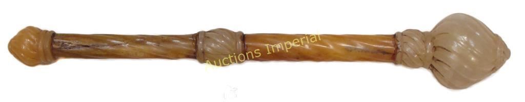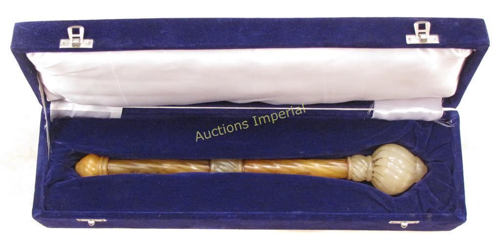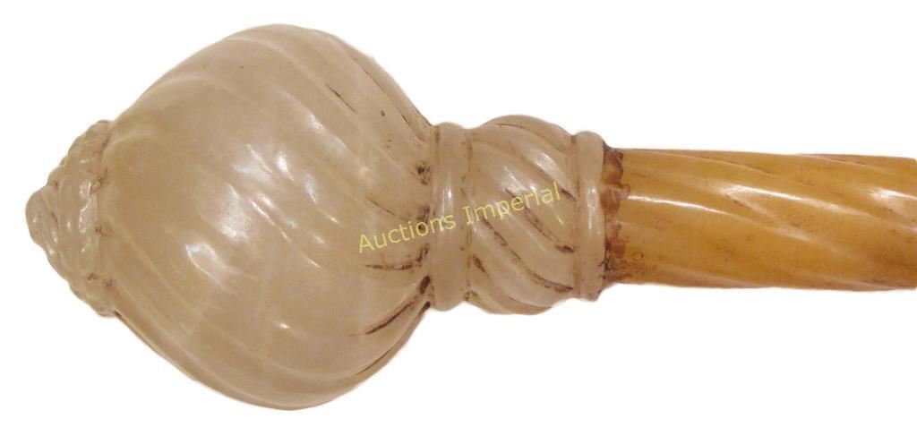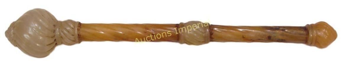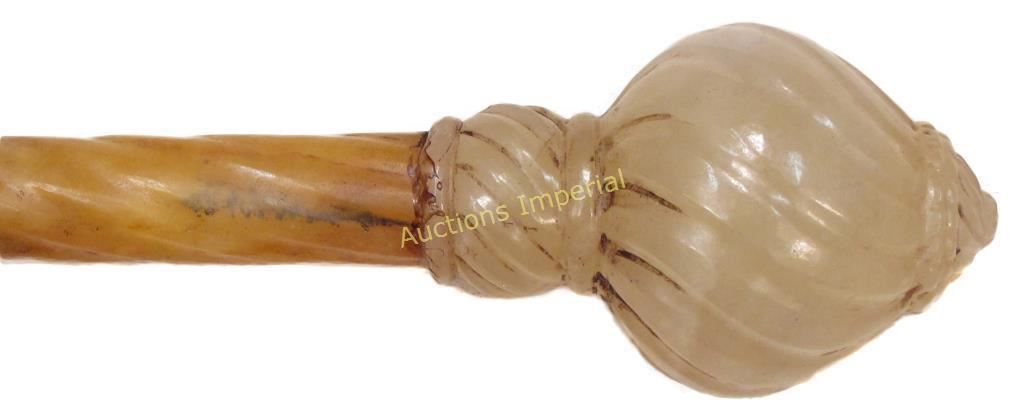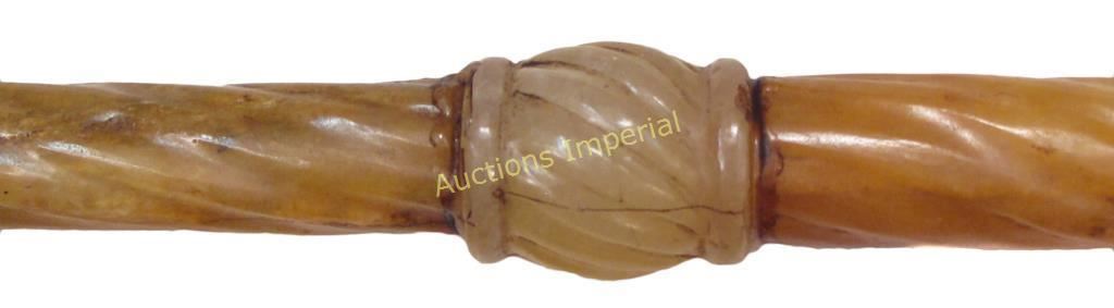 Composed of white jade and amber-colored stone, with graceful wrenched motif throughout, the onion-shaped head with elaborate finial. In a later fitted presentation case. 19th century. Traces of adhesive, very light wear. Overall length 45.5 cm.
