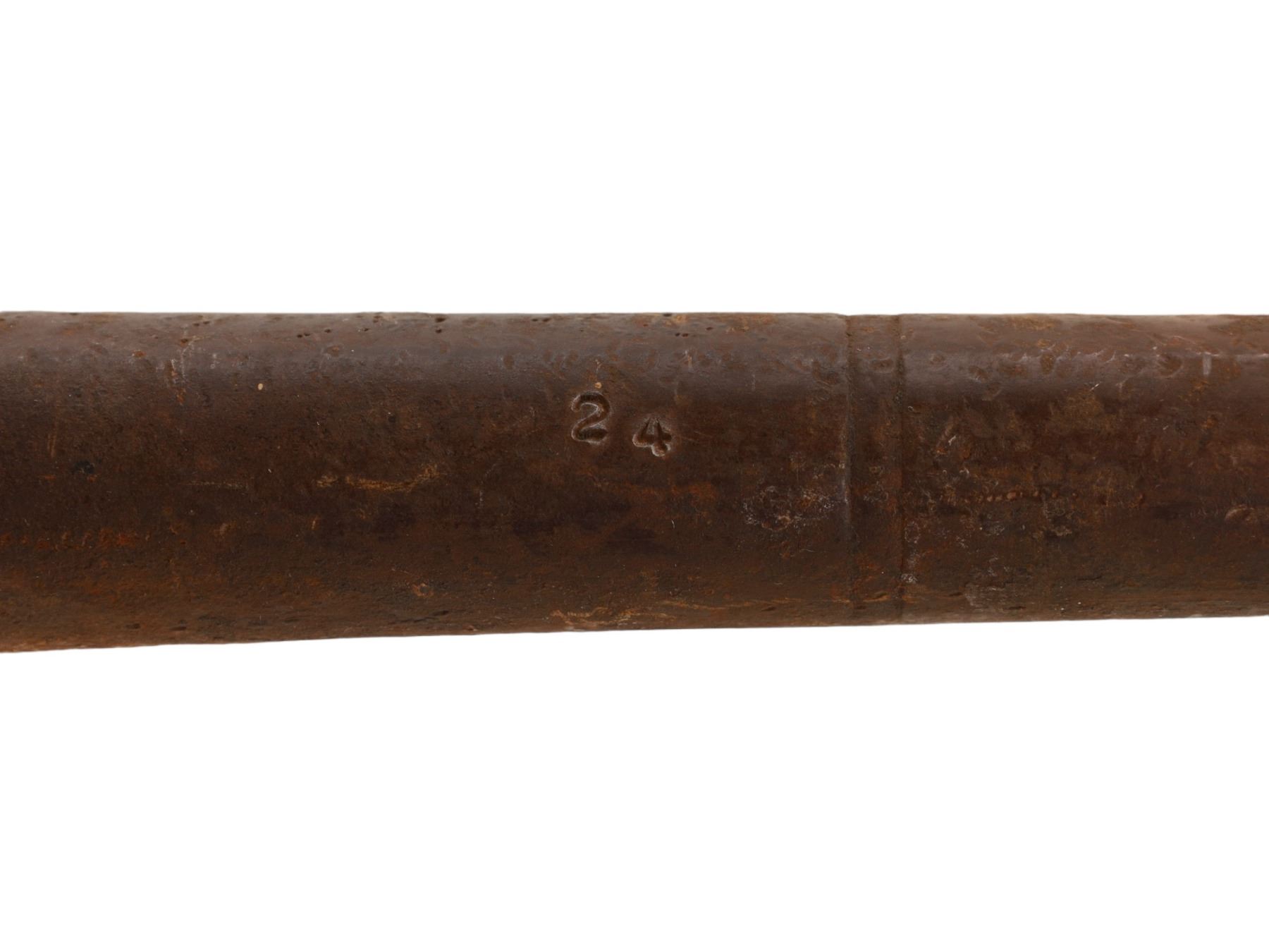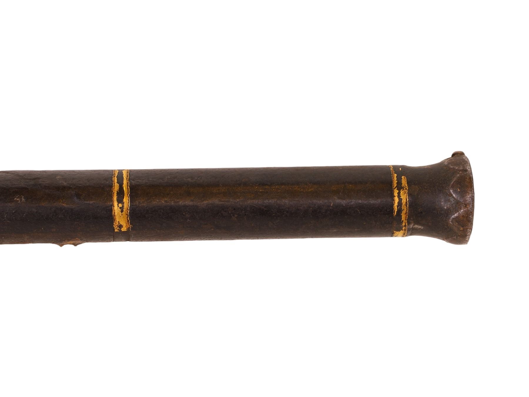 The barrel of an Indian percussion gun made of Damascus steel, with gold inlay near the muzzle. Some of the gold inlay has disappeared. There is floral relief both on the muzzle itself as well as a few inches down from the muzzle.