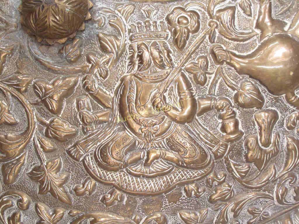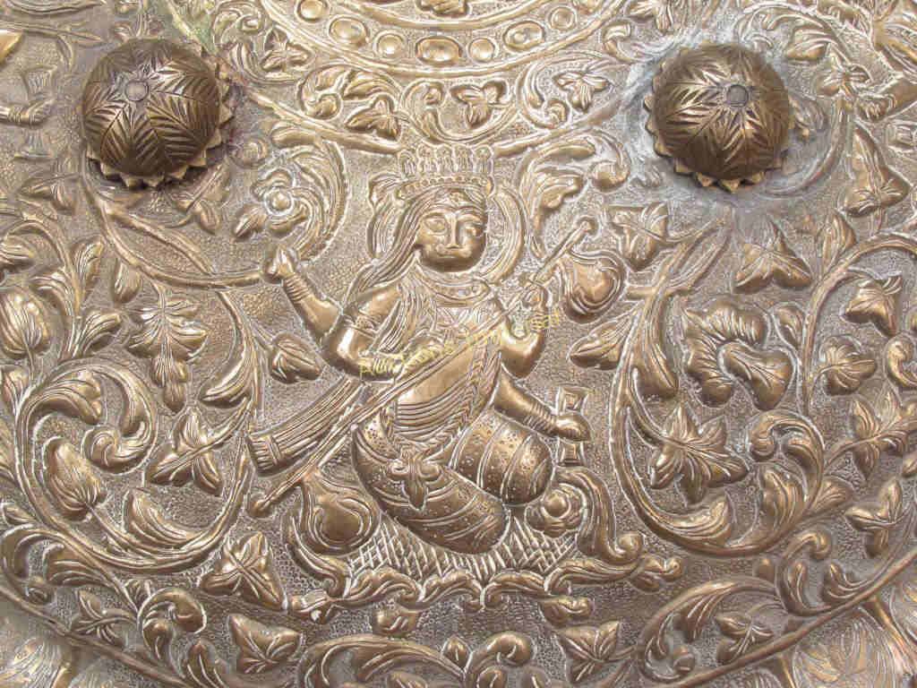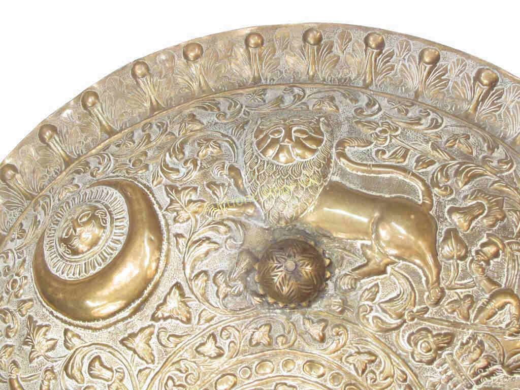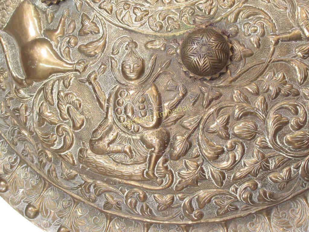 A large, highly embellished example. Handwrought of brass, and finely embossed and chased overall with lions and Indian god warriors all amongst foliage, surmounted by the Sun God, Surya. With applied bosses, the raised rim decorated with an acanthus leaf-border. Mid 19th century. VeryLight wear overall. Diameter 49.7 cm.