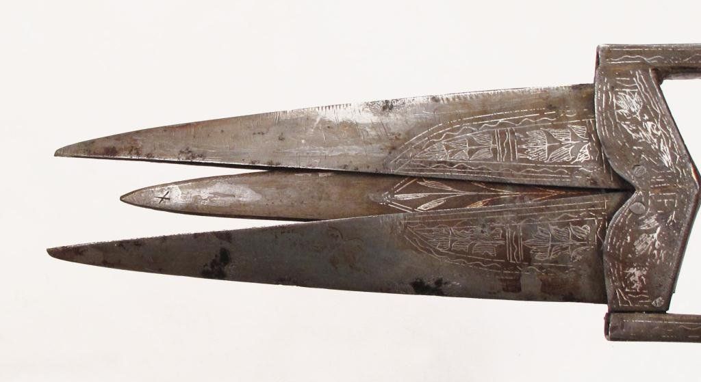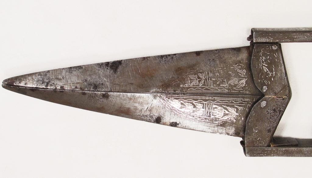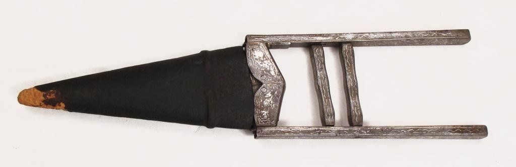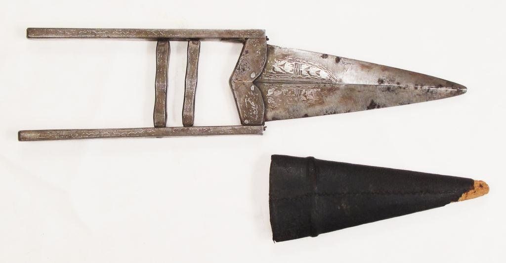 Of characteristic form, the hilt and forte of the blade inlaid with silver. When the grips are compressed, the blade springs apart into two halves to reveal an inner blade. In its later leather scabbard.Mid-19th century. Overall length 41.6 cm. Condition II