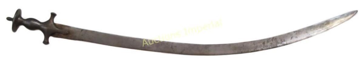 Characteristic iron hilt with remains of silver inlay, the massive, curved , single-edged blade wrought of actively patterned crystalline wootz. Late 18th-early 19th century. Worn. Overall length 91 cm