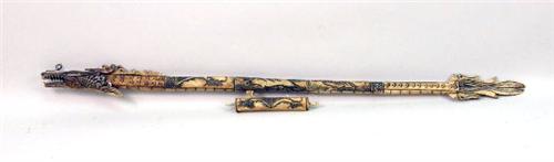 Etched with figures of a boar and tiger. With dart case and darts. 40"l Dart case damaged, repairs.