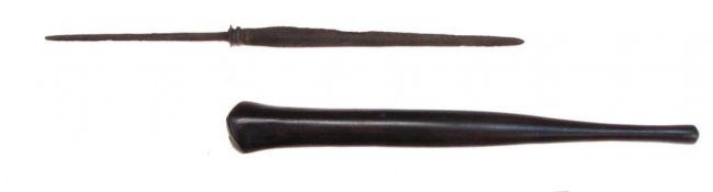 Handforged pamor blade with long tang.In its carved wood scabbard.Latter 18th-early 19th century.